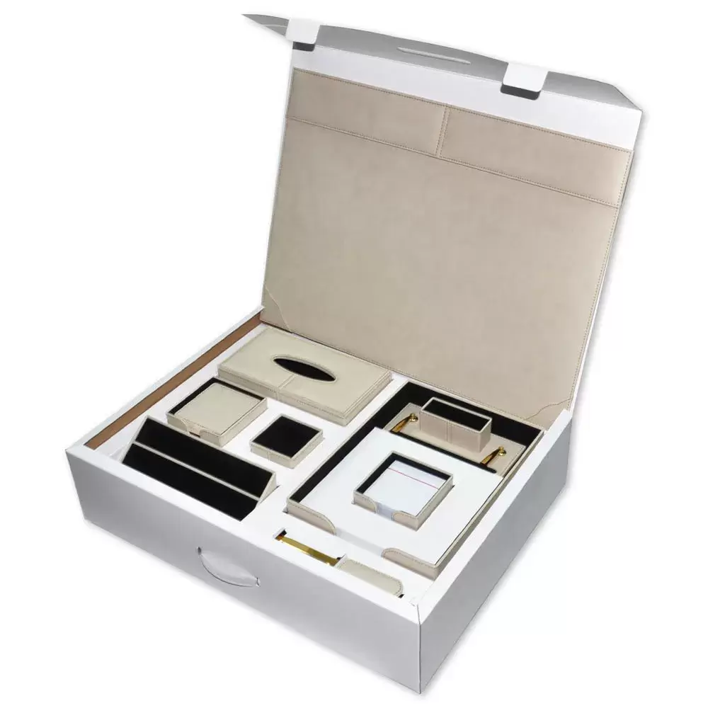 • FIS Desk Set 9-Piece: 1 x Foldable Desk Blotter, 1 x Office Tray, 1 x Tissue Box, 1 x Pen Holder, 1 x Paper Block Holder, 1 x Coaster, 1 x Letter Opener