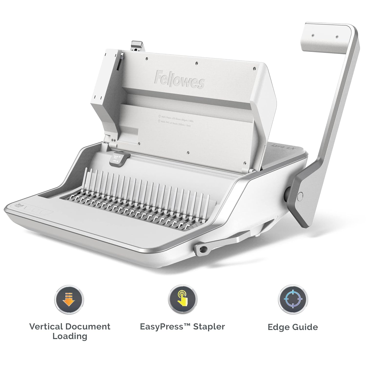 The unique Lyra Patented 3-in-1 Binding Center combines stapling, 3-hole punching and comb binding in one machine. EasyPress double action staplers offers effortless stapling for up to 30 pages. Comb binds documents up to 300 pages, comb punches 20 sheets, 3-hole punches 30 sheets Vertical loading enhances accuracy for faster punching and binding. Precision alignment of punching and stapling delivers perfect results. Includes a document and comb measurement guide for ease of use. The Lyra is built for the office / classroom library and more.