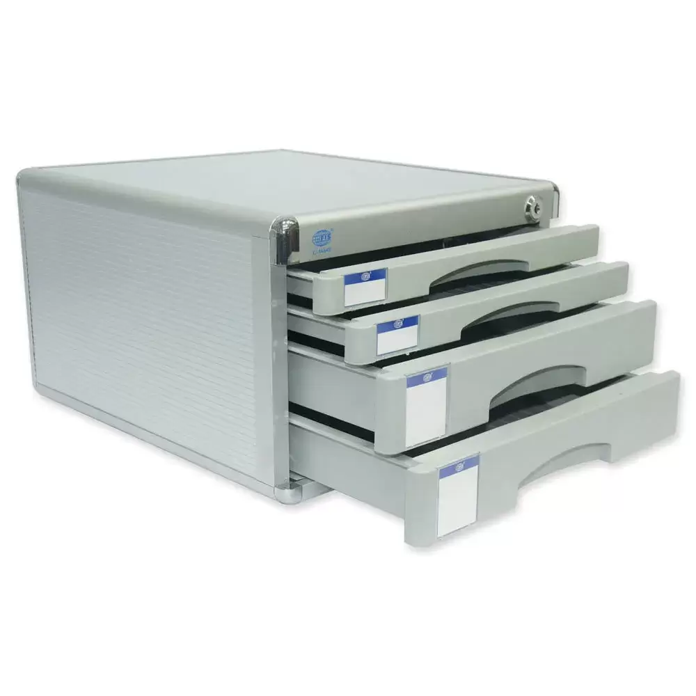 Type : Aluminium File Cabinet with key Number of Drawers : 4 Drawers Colour : Grey Size : 300 x 360 x 205 mm