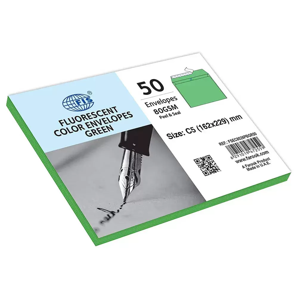 FIS Color Envelopes, Peel & Seal, Bright Green Colors, Pack of 50 Pcs. C5 (162 x 229 mm), 80 GSM – FSEC8026PBGR50