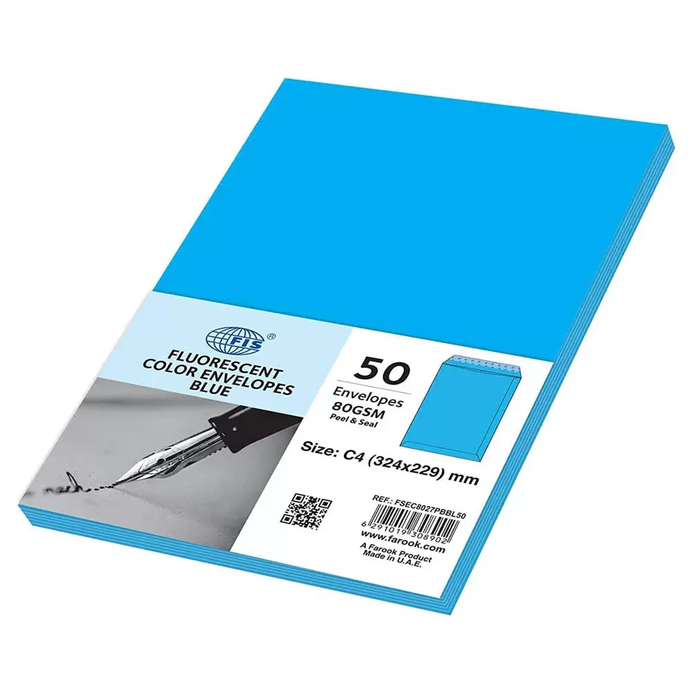 FIS Color Envelopes Peel & Seal, Neon Colors, Pack of 50 Pcs. Blue Color, C4 (324 x 229 mm), 80 GSM – FSEC8027PBBL50