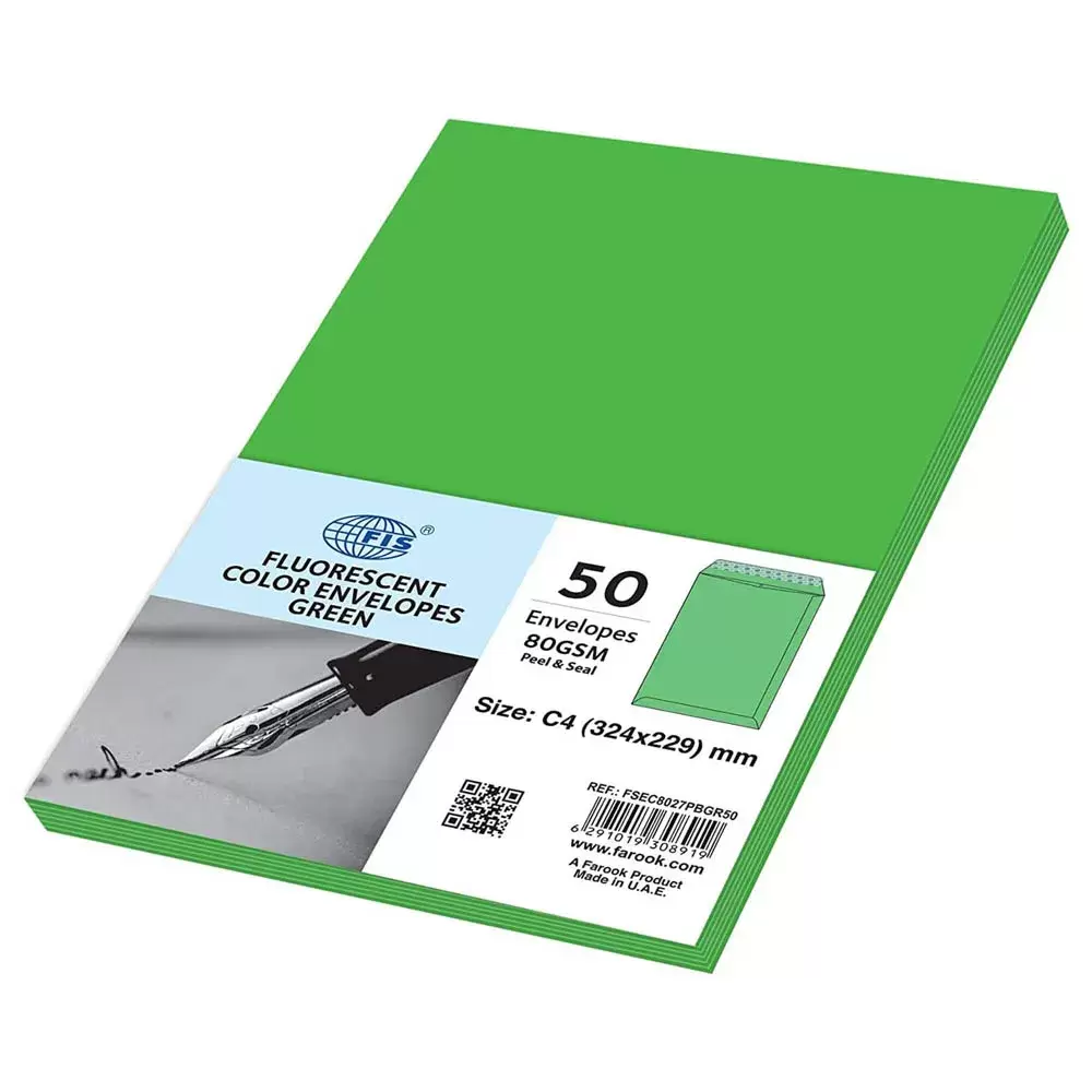 FIS Color Envelopes Peel & Seal, Neon Colors, Pack of 50 Pcs. Green Color, C4 (324 x 229 mm), 80 GSM – FSEC8027PBGR50