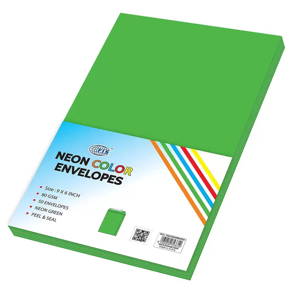 FIS Color Envelopes, Peel & Seal, Neon Green Colors, Pack of 50 Pcs. 9 x 6 inch, 80 GSM – FSEC8032PBGR50