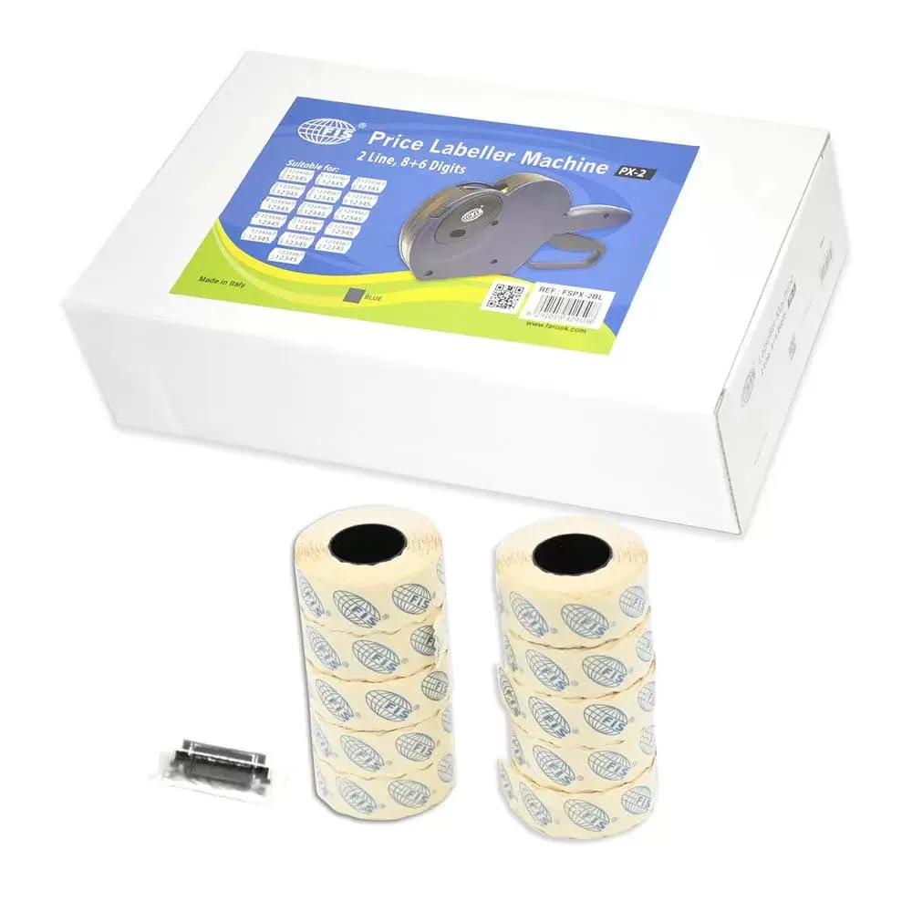 • Set contains : FSPX-2BL Which prints 2 line (8+6) Digits along with 1 Ink Roller and Pack of 10 Label rolls