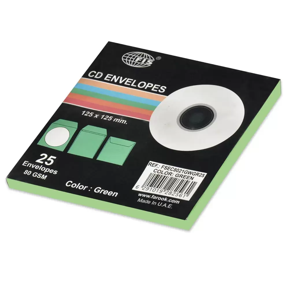 FIS Pack of 25 Color Envelopes, 80 GSM, Glued, Size 125X125mm, With Window, Color Green