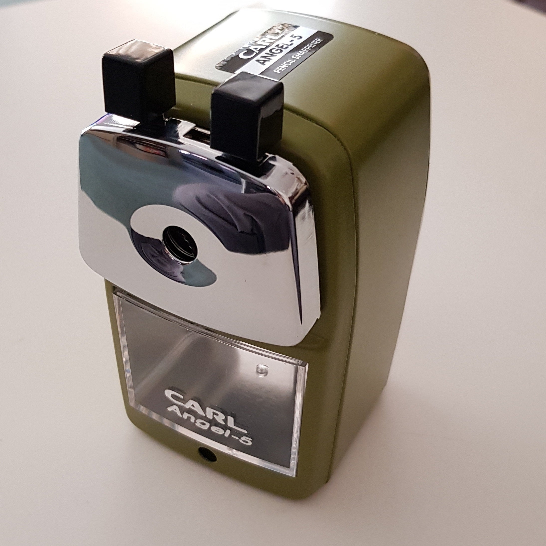 Carl’s Angel 5 mechanism automatically draws pencil into the cutting chamber, producing a perfect point. Once the pencil is sharp, the Angel 5 unique design will not allow the pencil to oversharpen. Shavings fall into a transparent waste tray that is removable for easy emptying. Pencil sharpener is manufactured with double-steel thickness along with a long-lasting, aluminum die-cast, internal gear mechanism and a steel case. It includes a desk clamp mount to fix it on your worksurface. Rubber feet grip base protects your desktop.